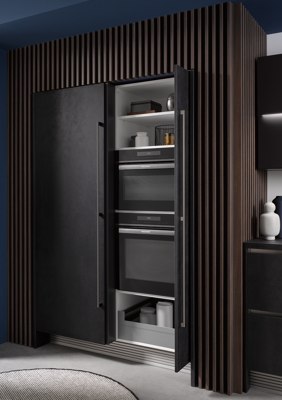 Een bijzonder hoogtepunt van deze keuken zijn onze pocket deuren: kastdeuren die naar opzij schuiven, voorzien van bijpassende roestvrijstalen handgrepen. Daarachter vinden de koel-vriescombinatie en de bak- en stoomoven in Dark Steel-design van BLAUPUNKT hun plaats. Als de deuren in de nis zijn verdwenen, kunt u hier heerlijk braden en bakken. Als u vervolgens met uw laptop aan het kookeiland wilt werken, sluit u gewoon de pocket deuren – en de sfeer is compleet anders.