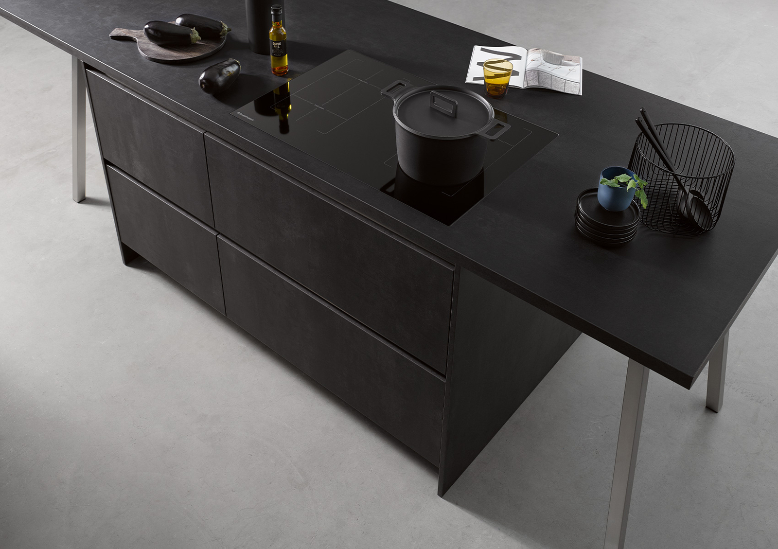 Het ensemble van deze concept130 COMET-GL beton zwart heeft een levendig gestructureerd spectrum van donkere tinten van antraciet tot zwart. Zwarte bovenkasten en PerfectSense®-werkbladen in mat zwart completeren dit keukendesign. Glanzende en matte geometrieën in metaallook zetten duidelijke accenten, vooral bij lichtinval, en creëren een goed gestructureerd, harmonieus geheel in het samenspel met de kleurenwereld van betonn-zwart.