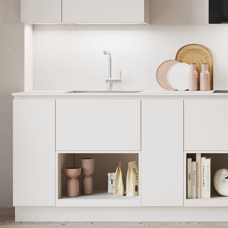 Het minimalistische keukenblok in PERFECT SOFT satijn overtuigt door functionaliteit in een tijdloos design. Eenvoudige PerfectSense®-fronten in satijn en een werkblad in dezelfde kleur creëren een lichte en uitnodigende sfeer. Met zijn strakke geometrische indeling blijft de keuken rechtlijnig en modern. Fijn detail: twee open legplanken werden geïntegreerd in de onderkasten om een tegenwicht te vormen voor het vlakke design van het keukenblok. De accessoires die erin zijn uitgestald, geven de keuken een nonchalante, ontspannen touch. Perfecte aanvulling: de ledstripverlichting geïntegreerd in de bovenkasten. Niet alleen uiterst praktisch, maar ook een esthetische highlight.