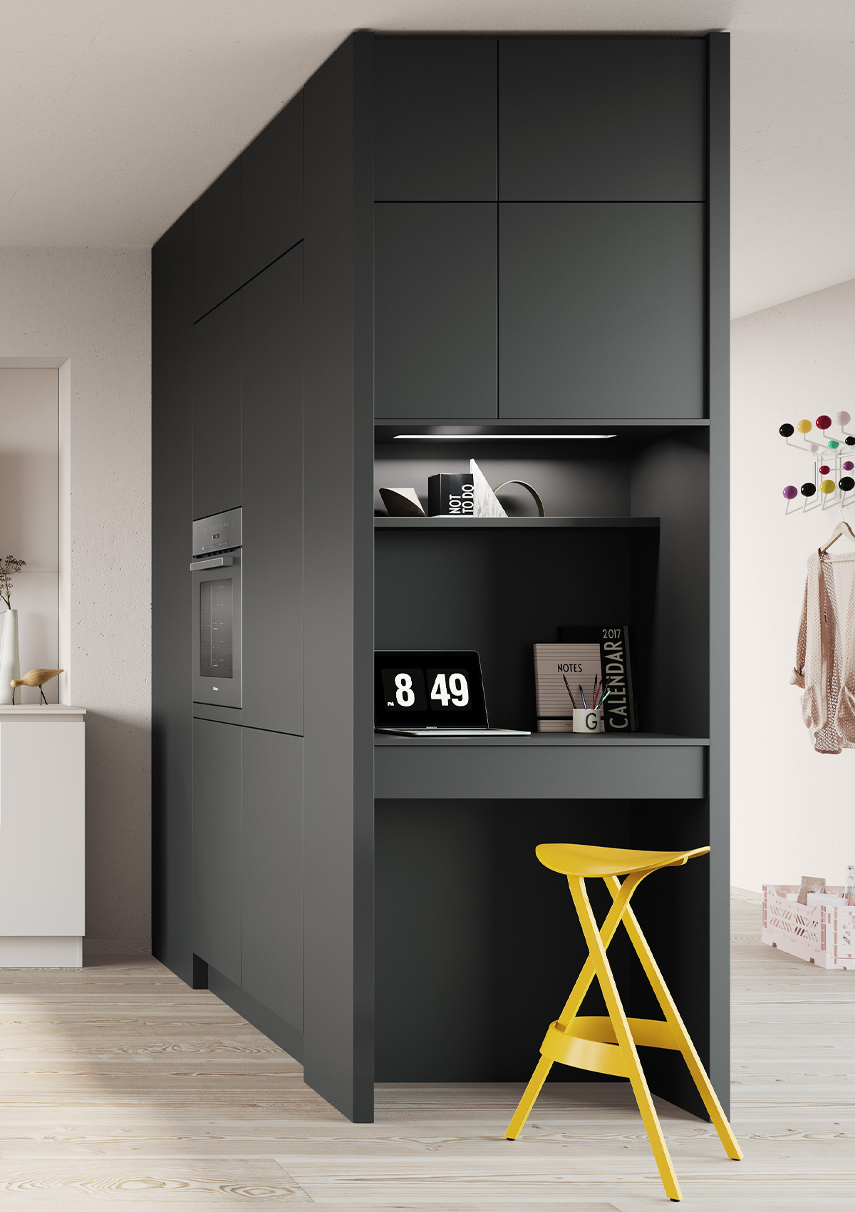Uitzonderlijk evenwicht: PERFECT SOFT-GL satijn en PERFECT SOFT grafiet imponeren door monochroom minimalisme. De satijnkleurige oppervlakken zijn de perfecte aanvulling op de donkere grafiettint en laten zien hoe duidelijke grenzen indrukwekkende contrasten creëren. Dit concept130-ensemble in greeploos, kubistisch design scoort met vindingrijke multifunctionaliteit. Het geïntegreerde minikantoor op de kop van het rechter keukenblok is bijvoorbeeld ideaal voor kleine kantoorwerkzaamheden. De keukenindeling is ontworpen met het oog op functionaliteit, biedt veel ruimte en past moeiteloos bij verschillende woonstijlen.